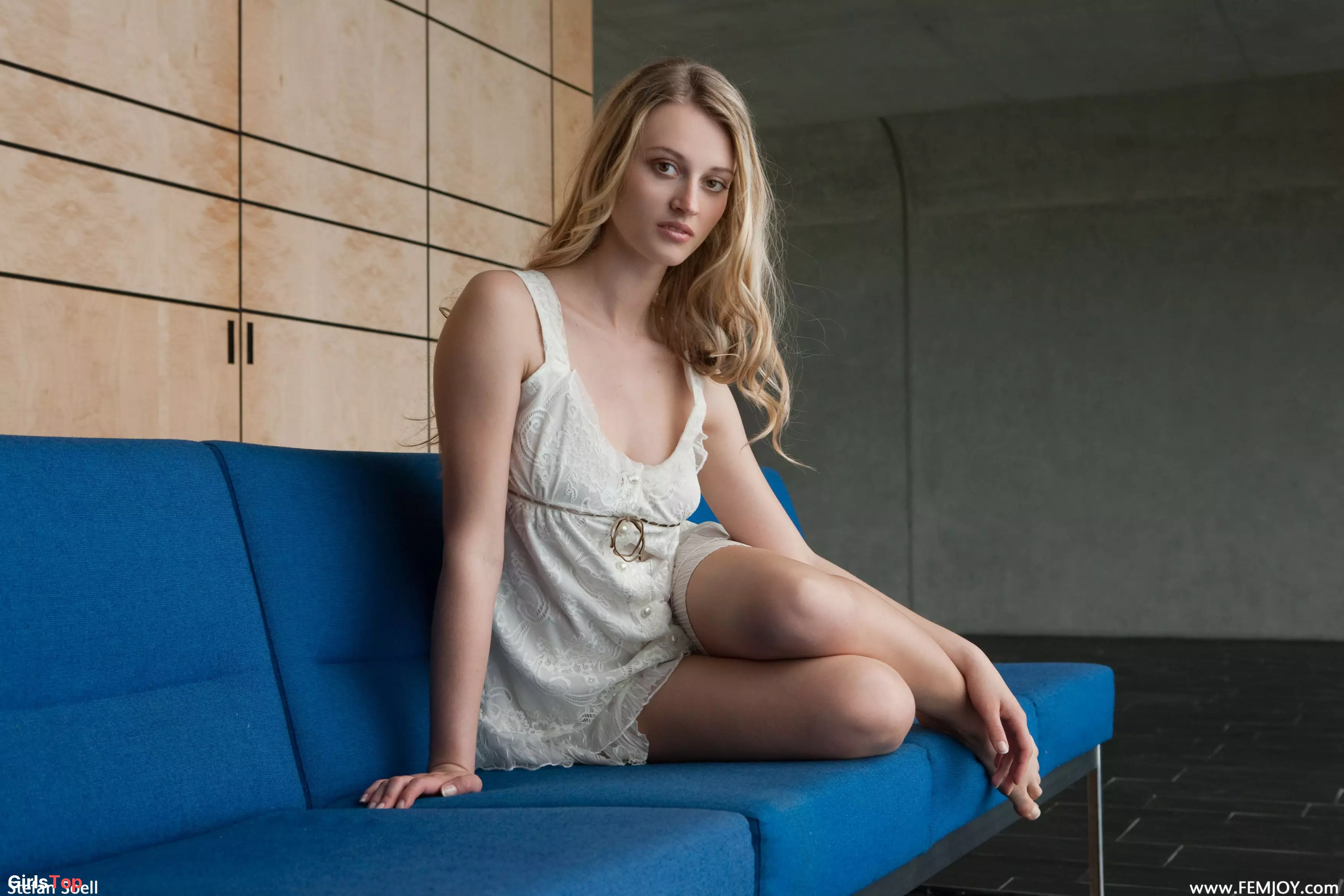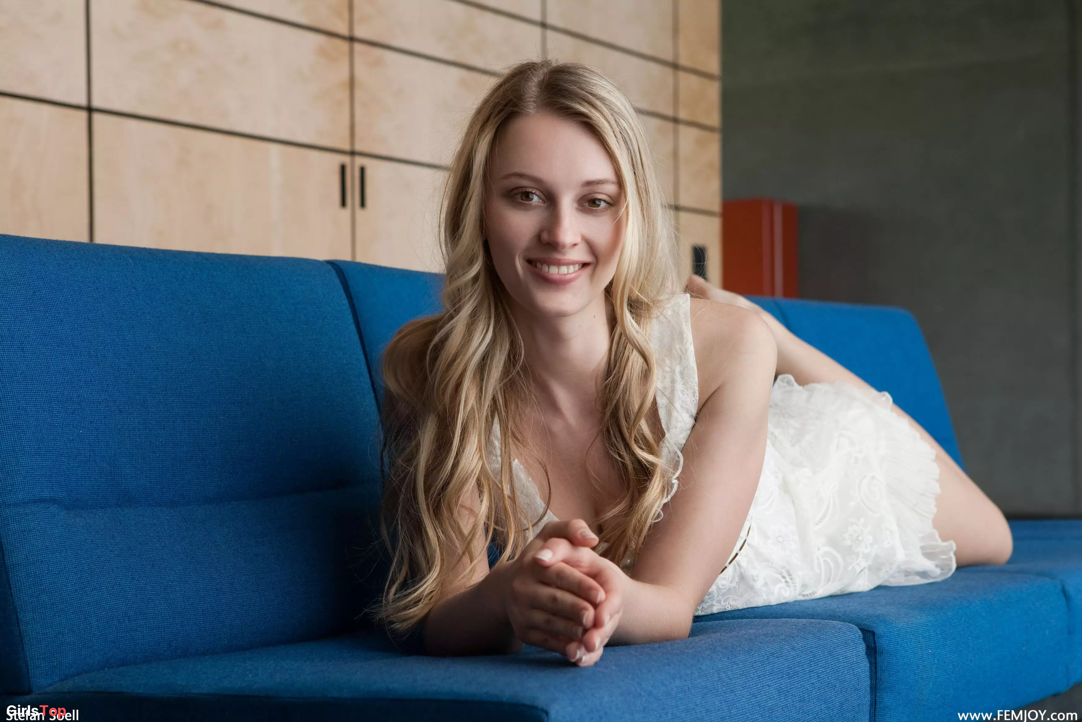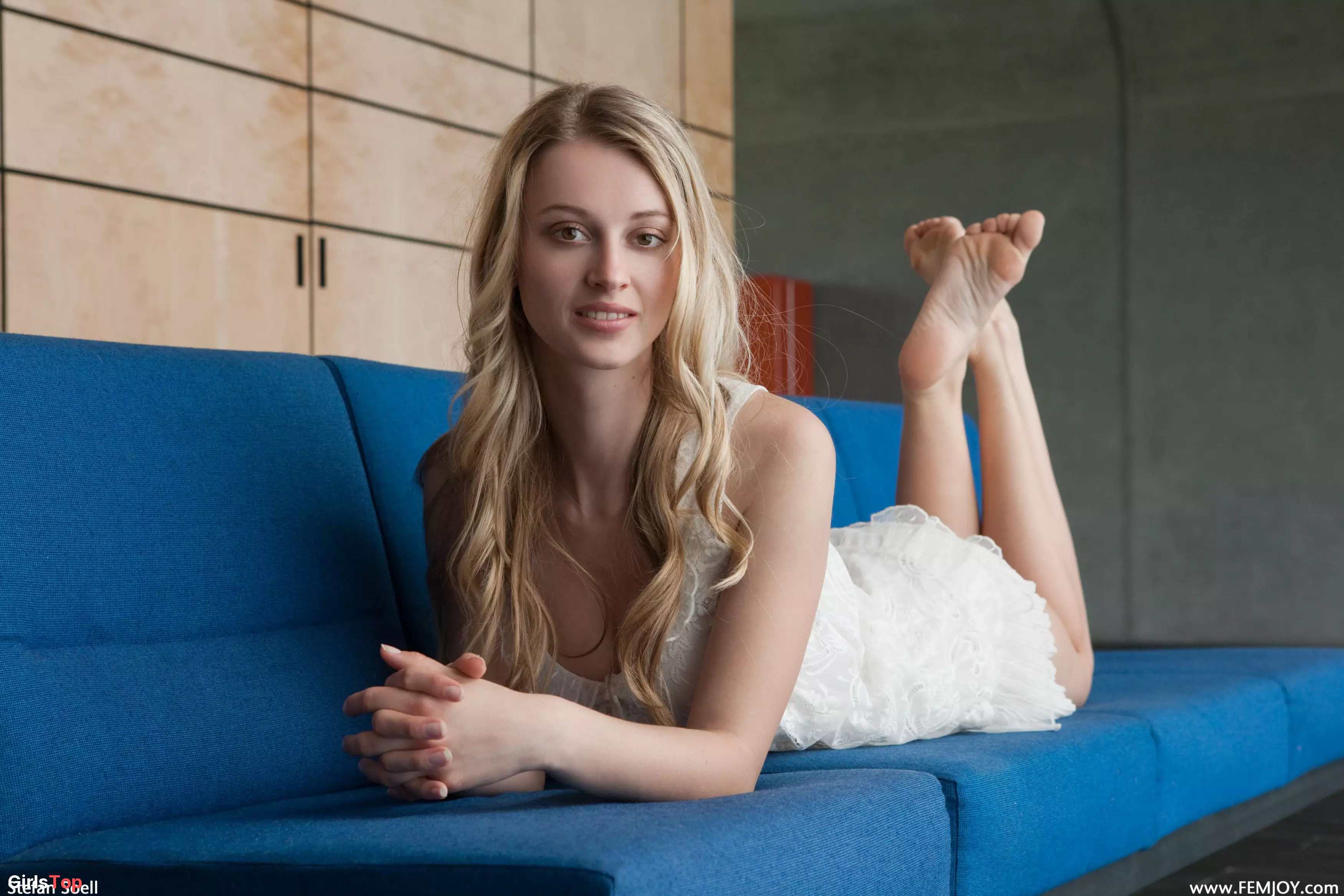 Счастливая блондинка позирует голая на диване — Carisha A